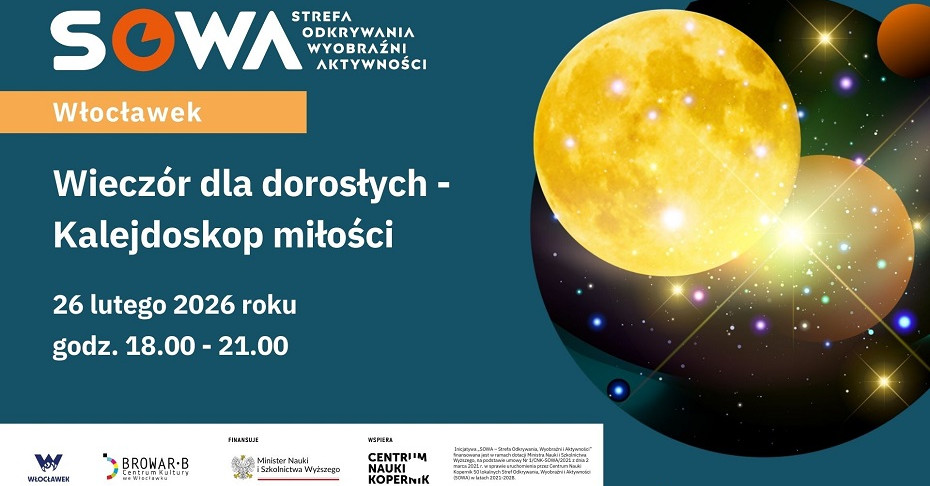 Wieczory dla dorosłych to cykl organizowany przez Centrum Nauki Kopernik. Będąc w gronie stref SOWA, mamy przywilej organizowania bliźniaczego wydarzenia w Centrum Kultury „Browar B."! W wieczornych godzinach strefa SOWA Włocławek otwiera się tylko dla pełnoletnich. Zapraszamy na nasz drugi „Wieczór dla dorosłych".