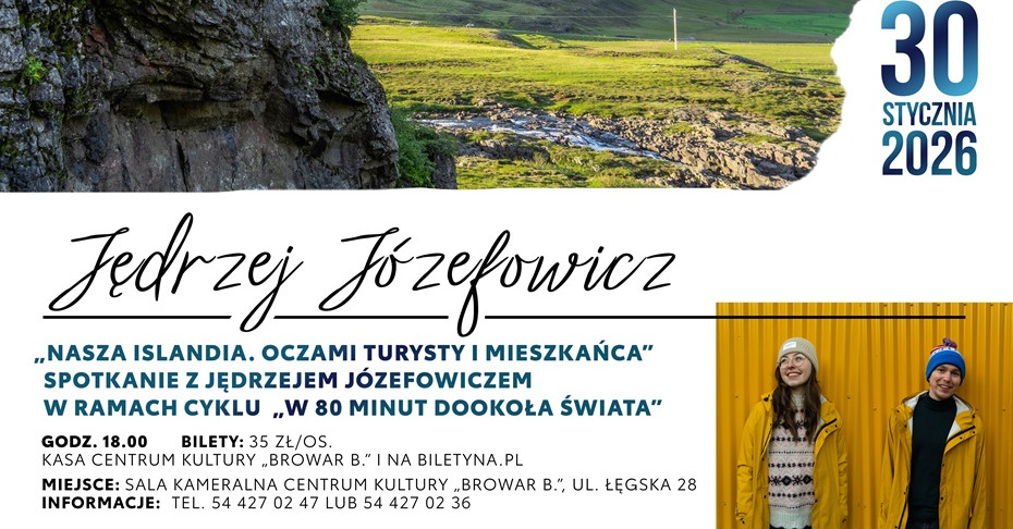 30 stycznia zapraszamy na spotkanie z Jędrzejem Józefowiczem – dziennikarzem, podróżnikiem i organizatorem Zaniemyskiego Festiwalu Przygód. Autor dwóch książek („Dziennik wędrowca” oraz „Wiadomość z Grenlandii”, nominowanej do Kolosów w kategorii „Podróż 2023 roku”) tym razem zabierze publiczność na Islandię.