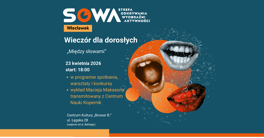 Bez dzieci. W dogodnych dla Ciebie godzinach. Raz w miesiącu strefa SOWA Włocławek otwiera się wyłącznie dla pełnoletnich. Kolejny raz zapraszamy na Wieczór dla dorosłych. Mamy dla Was interaktywne eksponaty na wystawie, warsztaty tematyczne oraz transmisję wykładu z Centrum Nauki Kopernik. Najbliższy Wieczór pt. „Między słowami” już 23 kwietnia.